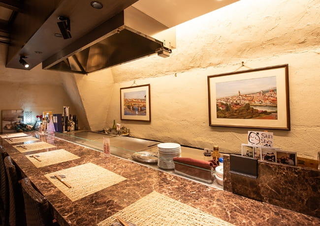 目の前で焼き上がるライブ感を楽しめる、SUN SHOの特等席。シェフとの距離も近く、料理の説明やおすすめの食べ方を聞きながら、初めての方でも安心してお食事をお楽しみいただけます。日本ならではの鉄板焼体験を味わえるカウンター席は、海外からのお客様にも人気のお席です。