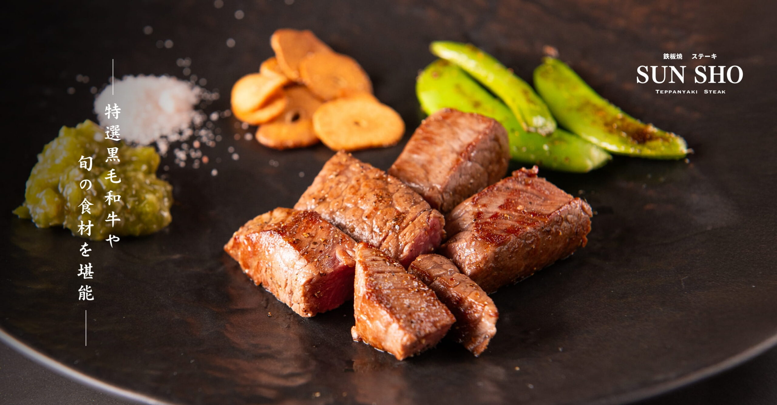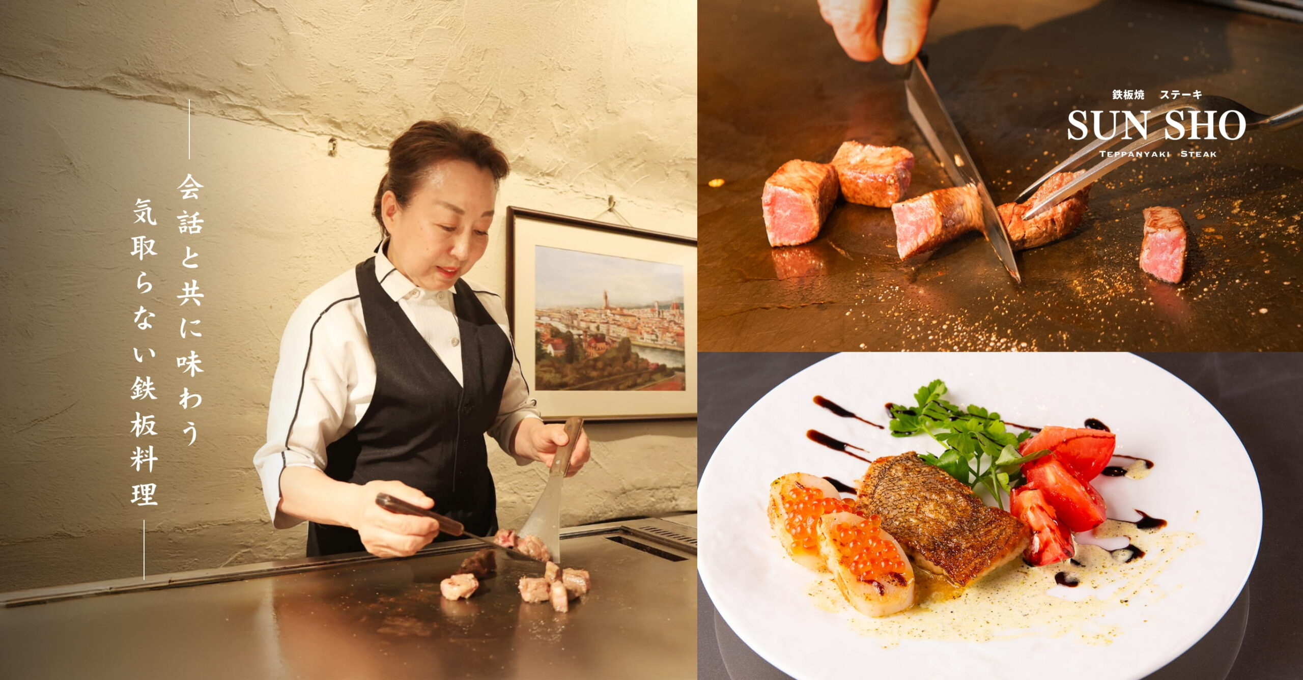 東京・赤坂見附駅から徒歩1分。「鉄板焼・ステーキ SUN SHO(サンショウ)」は、気さくなシェフが迎えるアットホームな雰囲気の中で、鉄板焼を楽しめるお店です。A5ランクの特選ブランド黒毛和牛をはじめ、旬の魚介や野菜を取り入れた料理を、目の前で丁寧に焼き上げます。臨場感あふれる鉄板焼とともに、大切な方とのひとときや、東京観光の際のお食事としてもご利用いただいています。